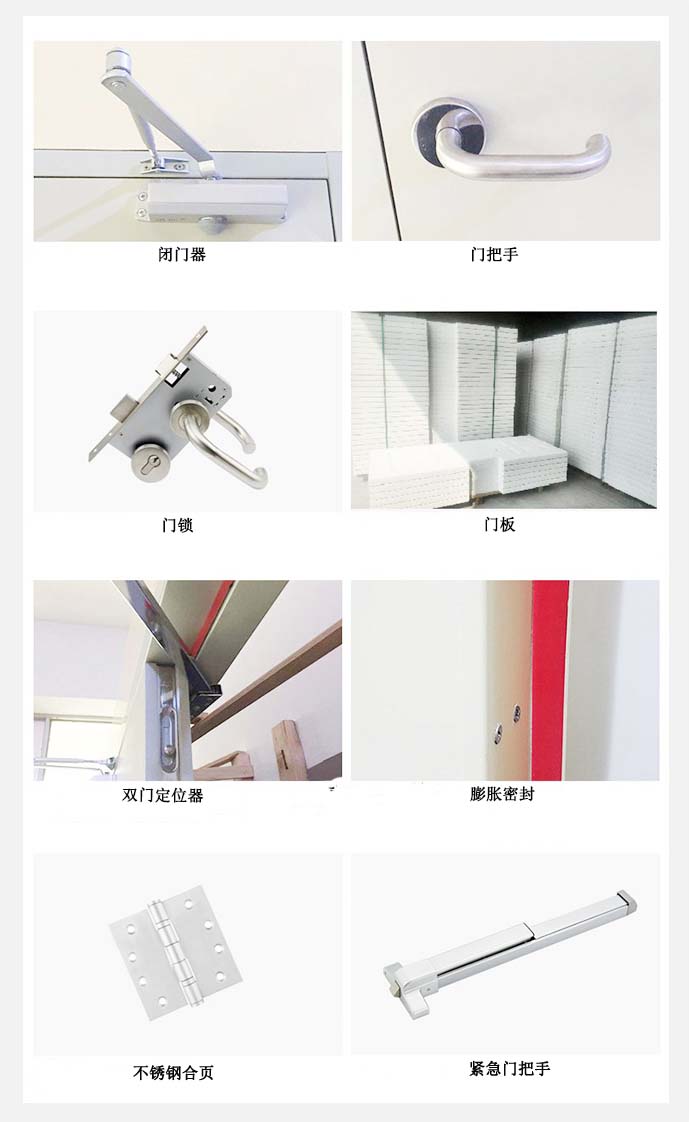 鋼質(zhì)防火門是指用冷軋薄鋼板作門框、骨架、門板,在門扇內(nèi)填充不燃隔熱材料,根據(jù)需要可以在門扇上安裝復(fù)合防火玻璃及門扇上方設(shè)有A類復(fù)合防火玻璃亮窗,并配以防火五金配件所組成的能滿足耐火完整性和隔熱性要求的門。鋼質(zhì)防火門按耐火極限可分為甲 級(jí)、乙級(jí)、丙級(jí)三類防火門,其耐火極限要求分別為72min、54min和36min。鋼質(zhì)防火門應(yīng)采用冷軋薄鋼板制作門框、門扇面板及加固件。門框與門扇鋼板厚度分別為1.2mm~1.5mm和0.8mm~1.2mm。加固件鋼板厚度為1.2mm~1.5mm,如設(shè)有螺孔則不低于3mm。用于鋼質(zhì)防火門的五金配件需要是耐火五金配件,主要五金配件為:防火合頁(yè)(鉸鏈)、防火插銷、防火門鎖、防火順序器和防火閉門器等。